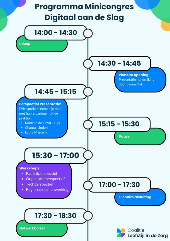 Tijdens het minicongres presenteren we kort de nieuwe handreiking Digitaal aan de Slag, maar het belangrijkste doel van deze middag is om samen een Agenda van de Toekomst te formuleren: een strategische routekaart die knelpunten adresseert en oplossingen biedt om digitale leefstijlzorg écht werkbaar en impactvol te maken.