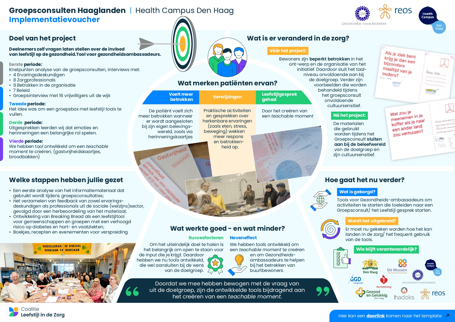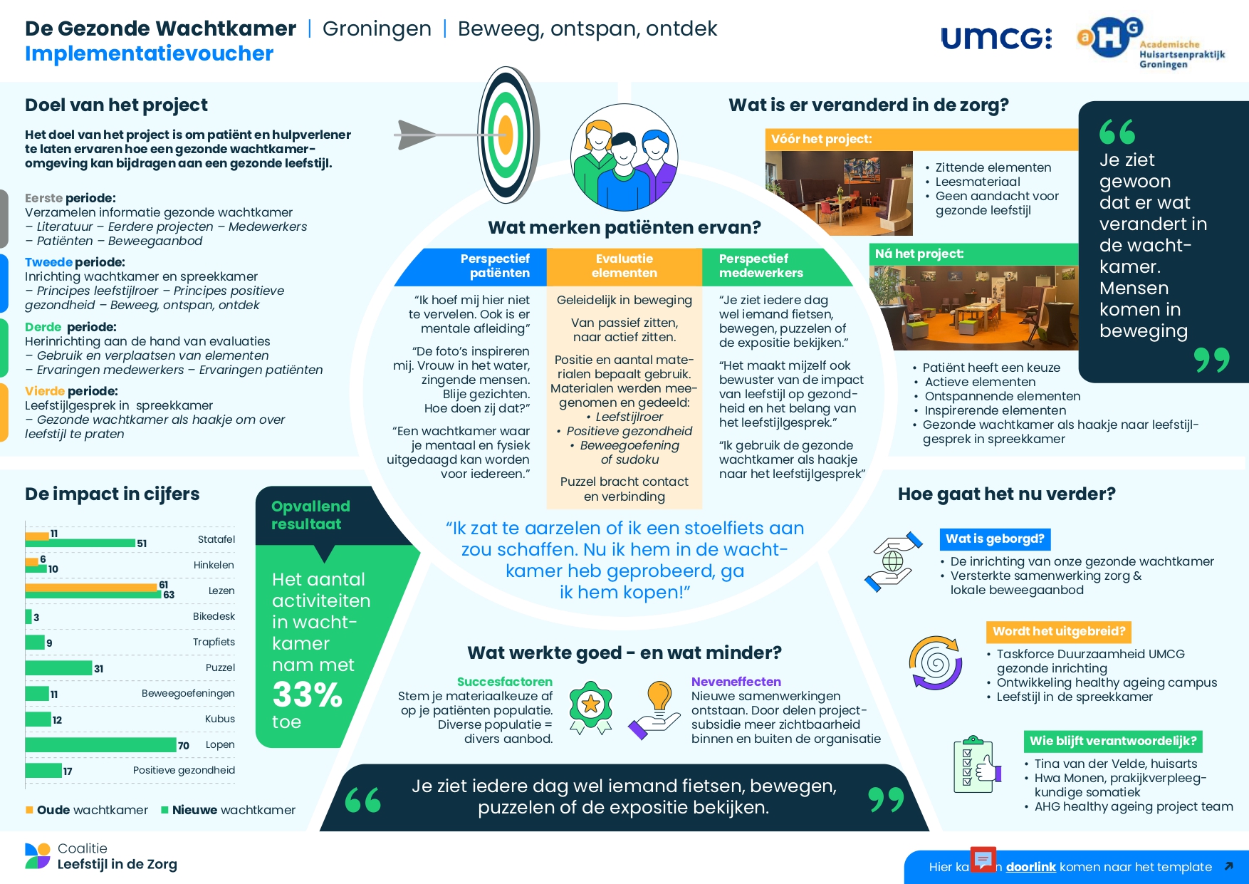 Ontdek projecten die met behulp van een implementatievoucher leefstijl in de zorg starten, versnellen of verbreden binnen zorginstellingen en samenwerkingsverbanden in de regio. Deze initiatieven laten zien hoe ideeën structureel worden geïmplementeerd, met blijvende impact op zorgprocessen en praktijkvoering.