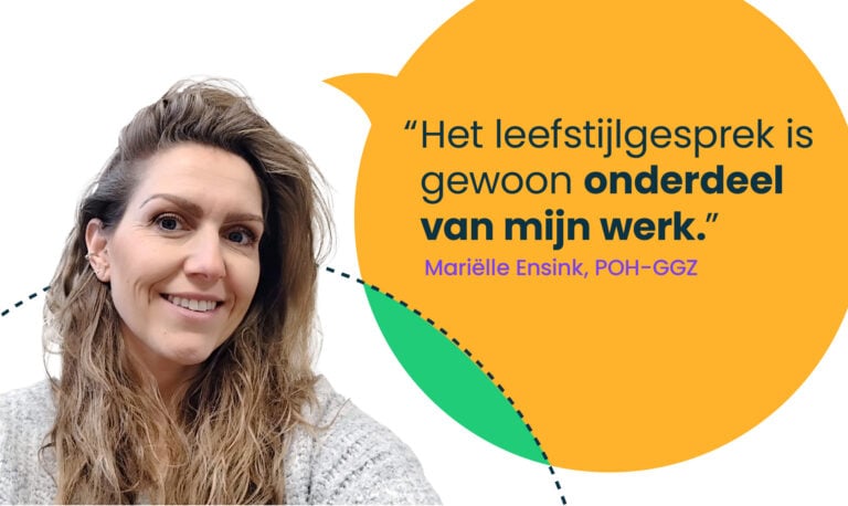 “Ik had er nooit echt bij stilgestaan dat ik leefstijlgesprekken toepas in mijn werk. Het hoort er voor mij gewoon bij”, vertelt Ensink vanuit haar woonkamer in Groenlo. In de negen jaar dat zij werkzaam is als POH-GGZ, is leefstijl altijd een vanzelfsprekend deel van haar werk geweest. Totdat ze een jaar geleden werd benaderd om te spreken in een webinar over leefstijlinterventies. “Mijn eerste reactie was: ‘Nee, ik ben daar absoluut niet het type voor!’”, zegt Ensink lachend. “Maar toen ze meer vertelden over het onderwerp, kon ik er eigenlijk niet meer onderuit. Ik vind het te belangrijk en was me er niet voldoende van bewust dat het nog niet de standaard was. En uiteindelijk vond ik het webinar ook heel erg leuk om aan mee te doen.”