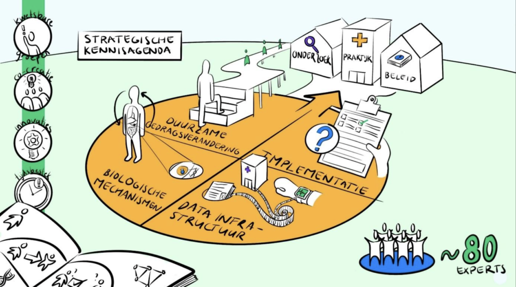 Om tot de kennisagenda te komen bracht de Coalitie ruim 80 experts van 28 kennisinstellingen bijeen. De doelstelling was om te benoemen welke kennis nog ontbreekt maar essentieel is voor het vergroten en verbreden van het potentieel van leefstijlinterventies in de behandeling van leefstijlgerelateerde aandoeningen in of vanuit de zorg. “Het gezamenlijke is heel belangrijk in dit proces. We zijn echt samen opgetrokken en hebben krachten gebundeld vanuit vier thema’s: 1) duurzame gedragsverandering op patiënt-, zorgprofessional- en organisatieniveau; 2) optimaliseren van onderzoeksopzetten, methodologie en resultaten voor de evaluatie van de effectiviteit en implementatie van leefstijlinterventies; 3) beter begrip van biologische mechanismen die ten grondslag liggen aan succesvolle leefstijlinterventies en 4) verbeteren van gezondheidsdata-infrastructuur voor burgers, zorgprofessionals, onderzoekers, gemeenten en zorgverzekeraars voor monitoring en evaluatie van interventies”, legt Kremers uit.